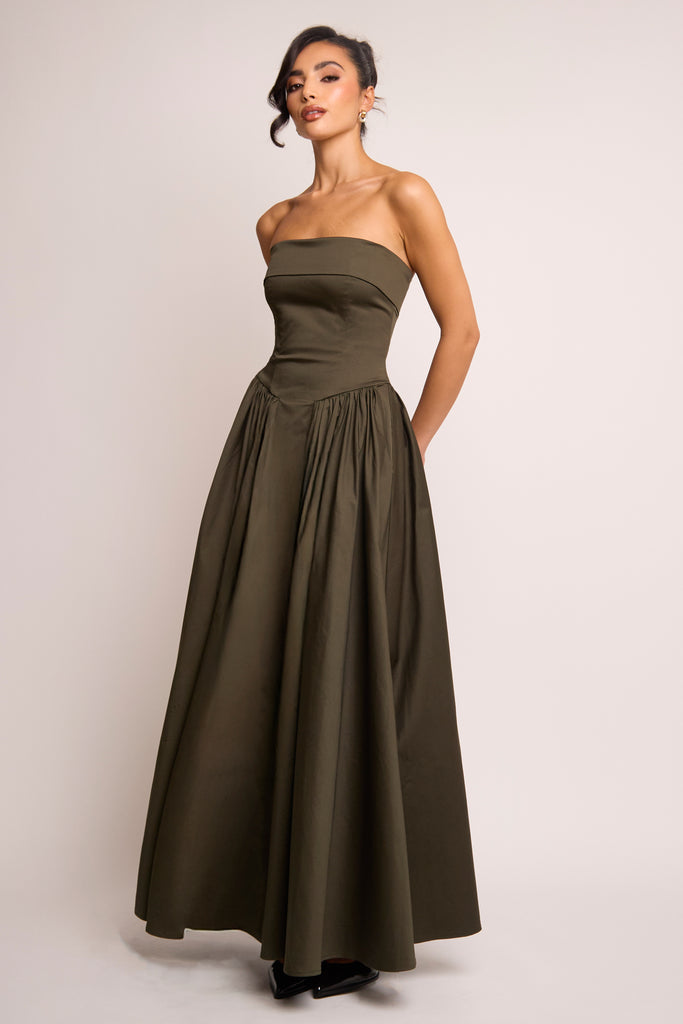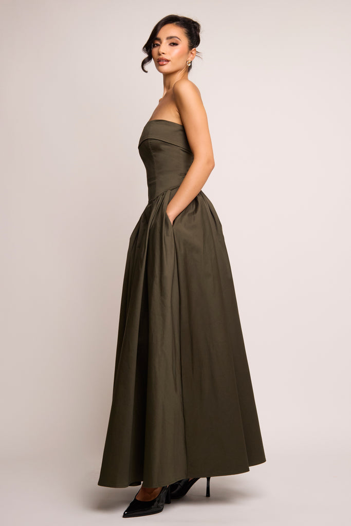Edith Winter Olive Bandeau Corset Gown Maxi Dress