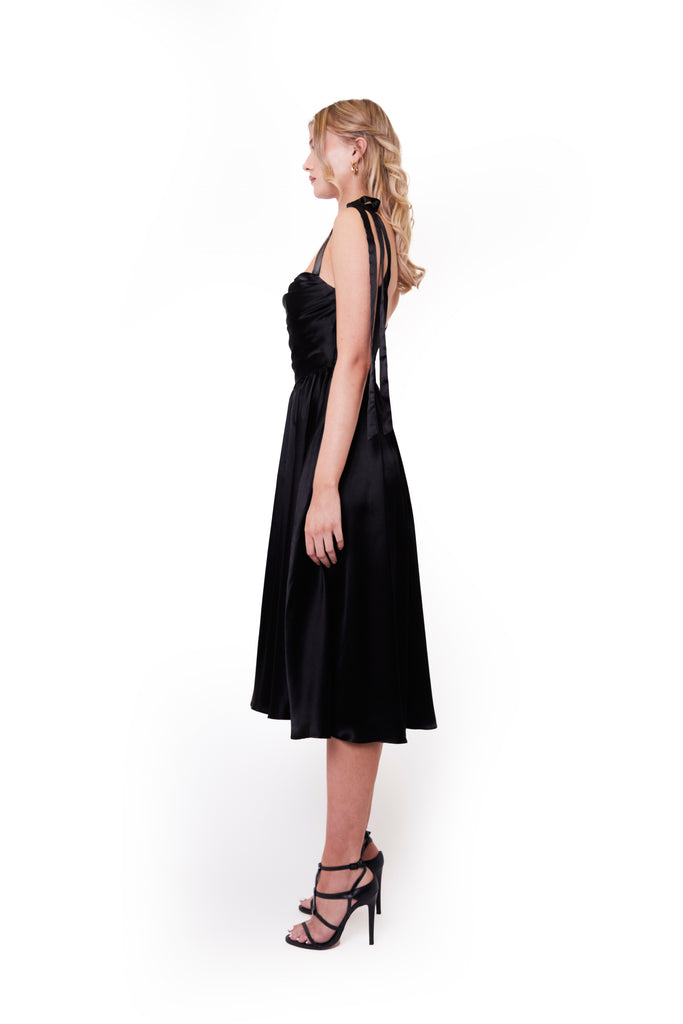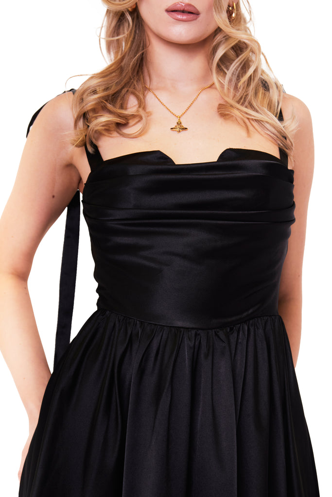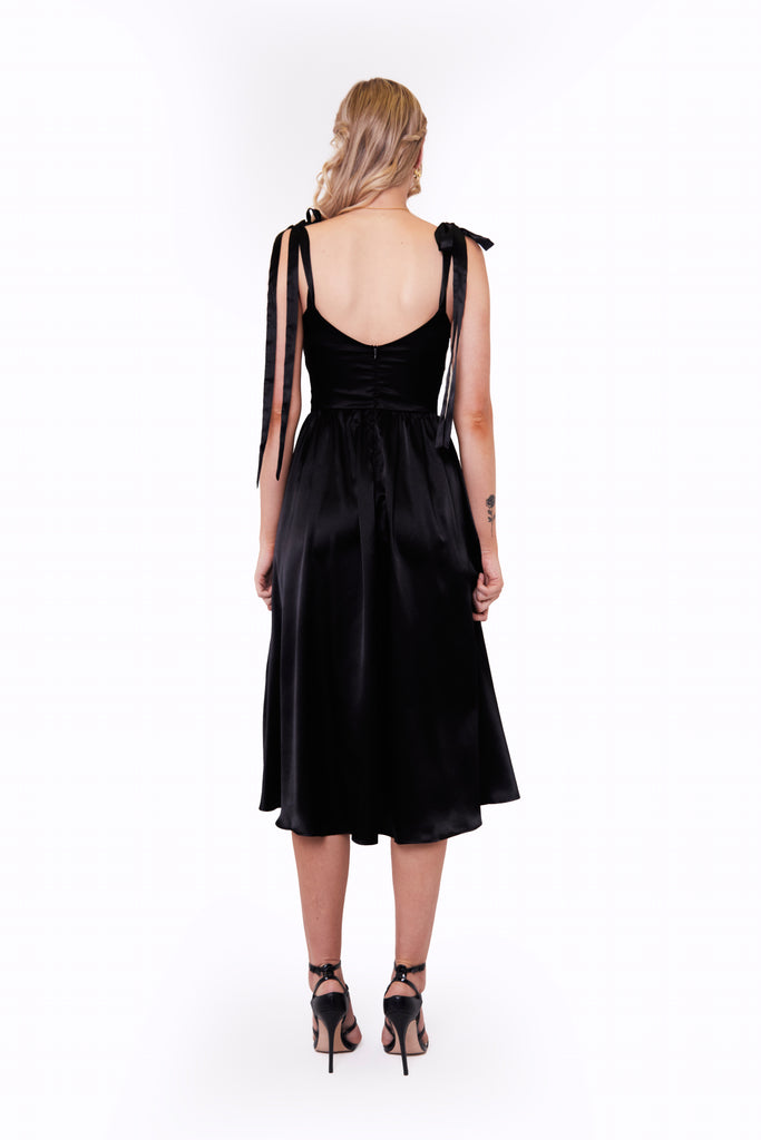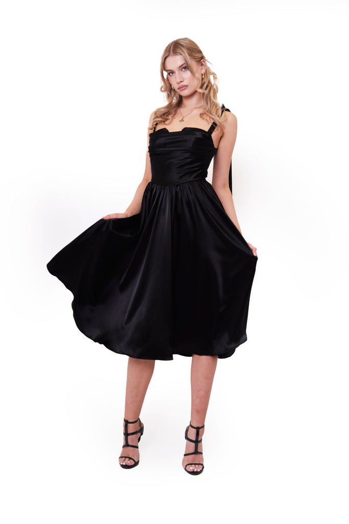 Amor Black Cowl Bow Strap Satin Midi Tea Dress