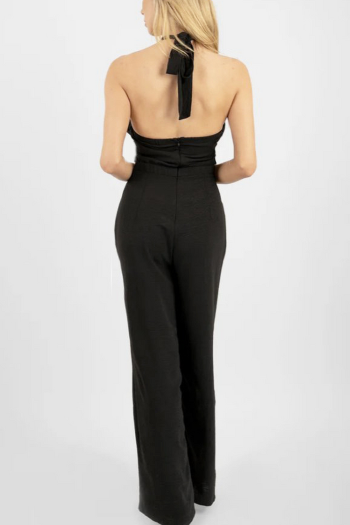 Elevate your wardrobe with the Betsy Jumpsuit. This elegant jumpsuit features a sophisticated halter neckline with intricate draping, creating a flattering silhouette that exudes confidence. The wide-leg design provides both comfort and a touch of glamour, while the open back with a tie closure adds a hint of allure. Perfect for a range of occasions, the Betsy Jumpsuit is a versatile addition to your collection.