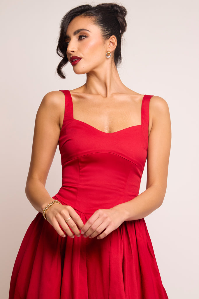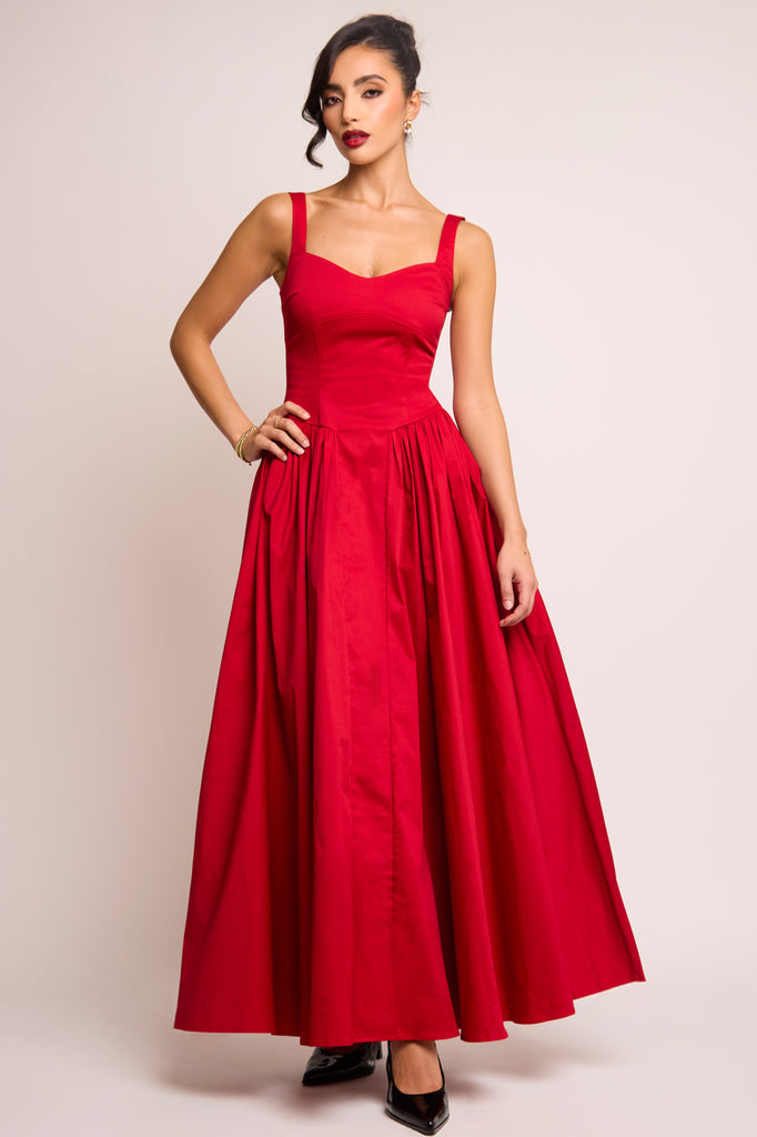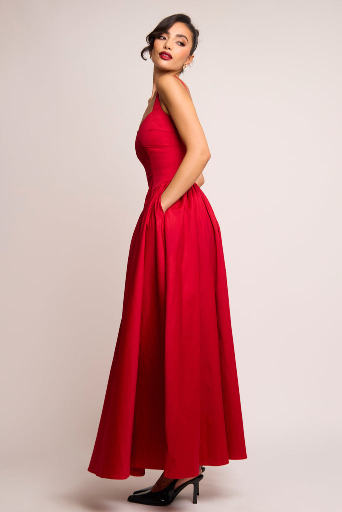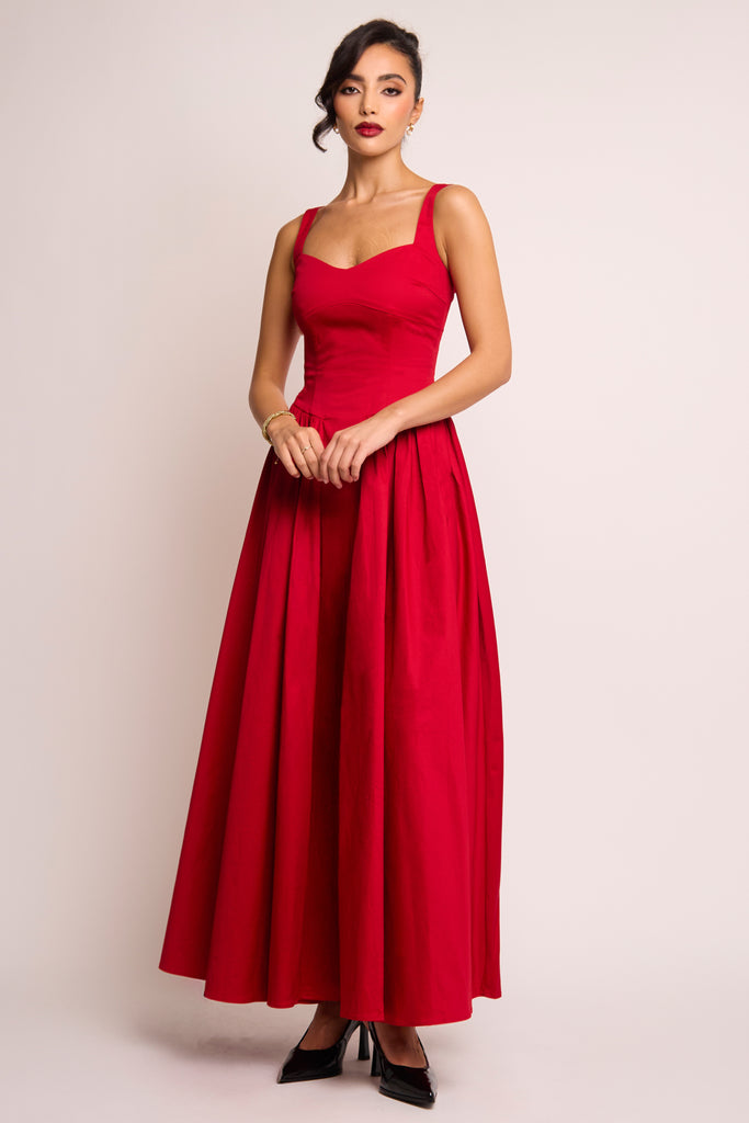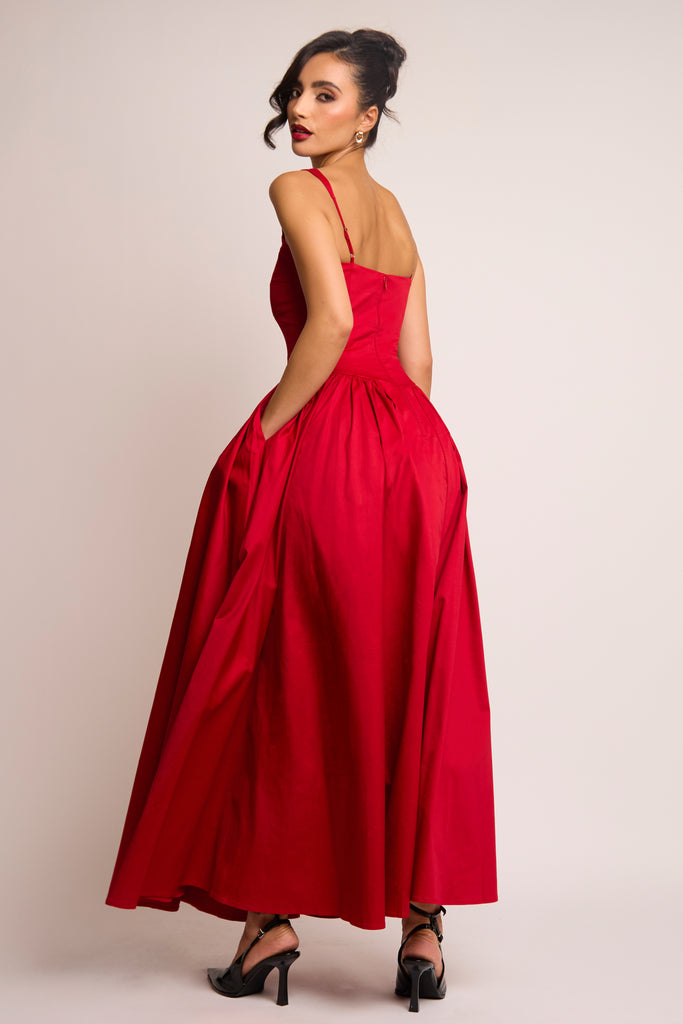 Romantic, refined, and undeniably striking. The Cerra Maxi Dress is crafted from breathable cotton in a bold, dramatic red, a perfect shade for both festive and romantic occasions. Designed with a soft sweetheart cami neckline and wide adjustable straps, the sculpted bodice features panel detailing to contour the shape. The full gathered skirt falls gracefully to the floor, complete with a central panel for added structure and flow. Elegant, timeless, and made to make an entrance.