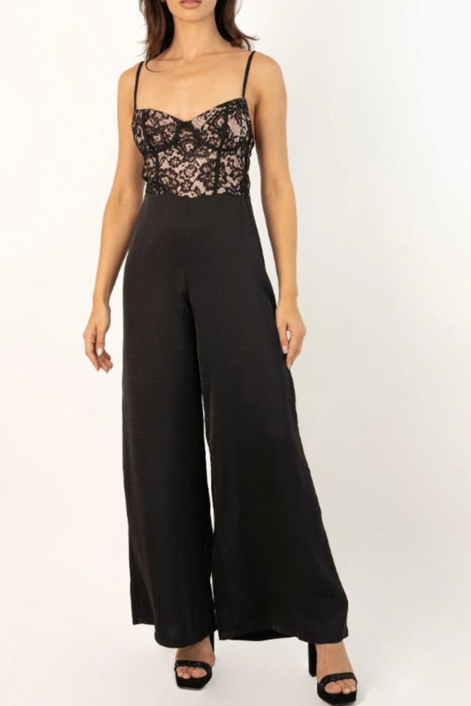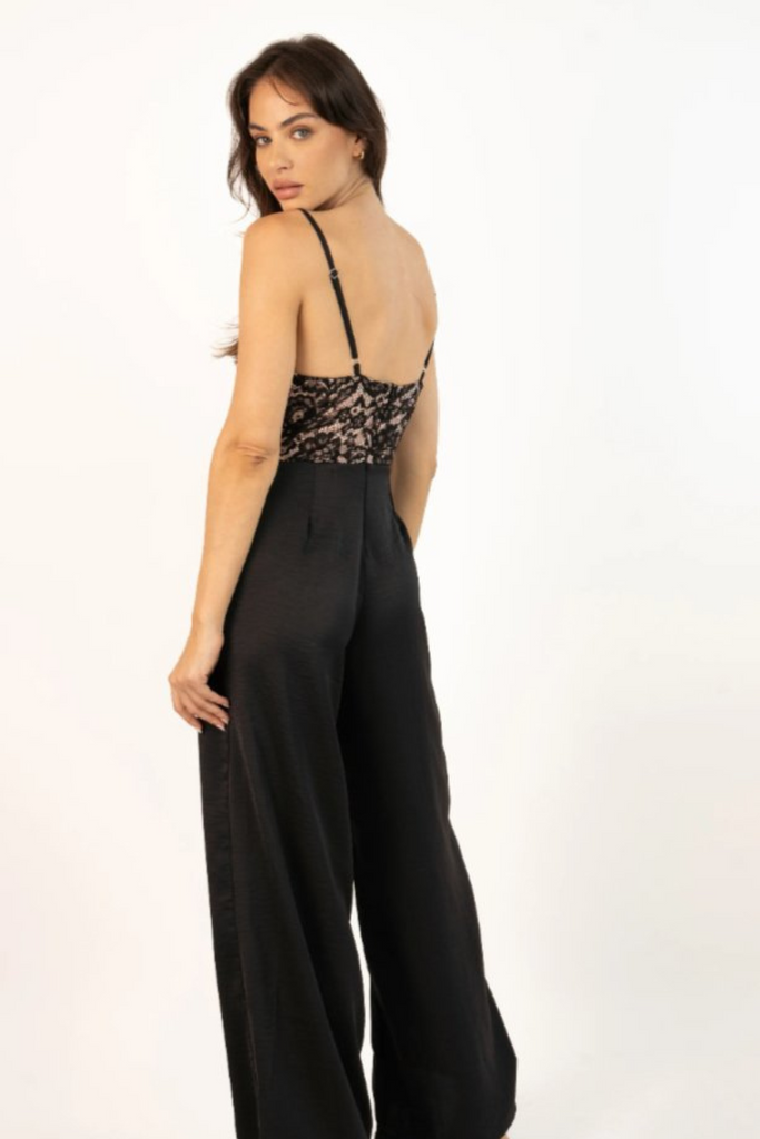Introducing the Charlie Jumpsuit, a perfect blend of elegance and allure. This striking jumpsuit features a delicate lace bodice with a sweetheart neckline, complemented by adjustable spaghetti straps for a customized fit. The wide-leg pants offer a comfortable yet chic silhouette, making it an ideal choice for various occasions.