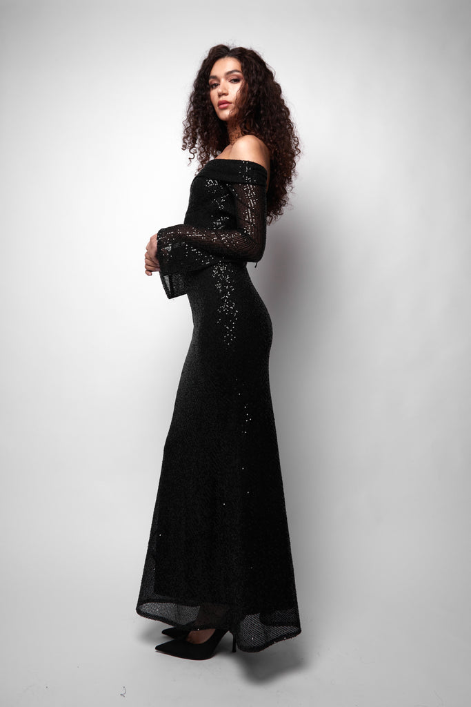 Step out in elegance with the Conna Black Bardot Sequin Maxi Dress, designed to captivate at any event. This stunning dress features an off-the-shoulder Bardot neckline that exudes timeless sophistication. The dress is adorned with shimmering black sequins, creating a sleek and glamorous silhouette. The low cowl back adds a sultry touch, while the double-lined body provides comfort and coverage. The arms are single-lined with mesh flared sleeves, allowing for graceful movement with a delicate, sheer look.