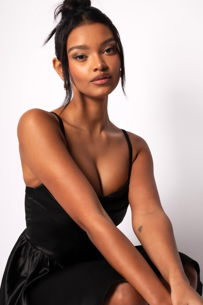 Make a statement with the Dora Black Mini Cowl Dress, a stunning blend of simplicity and sophistication. This dress features a flattering cowl neckline and a fitted bodice that flows into a voluminous flared skirt, creating a beautiful silhouette. The adjustable spaghetti straps add a touch of delicacy, while the mini length makes it perfect for showing off your legs. This versatile piece can be dressed up for a night out or styled for a chic daytime look.