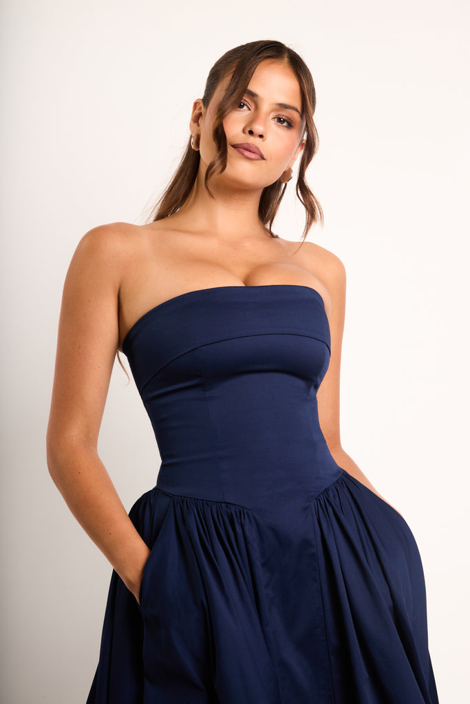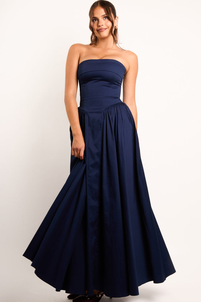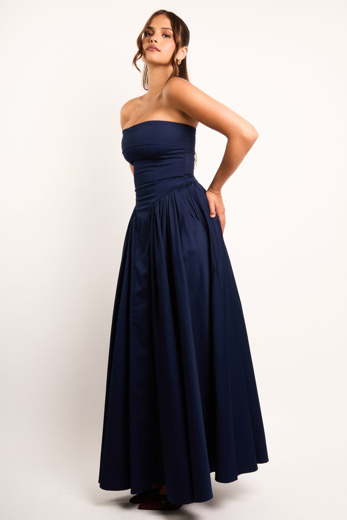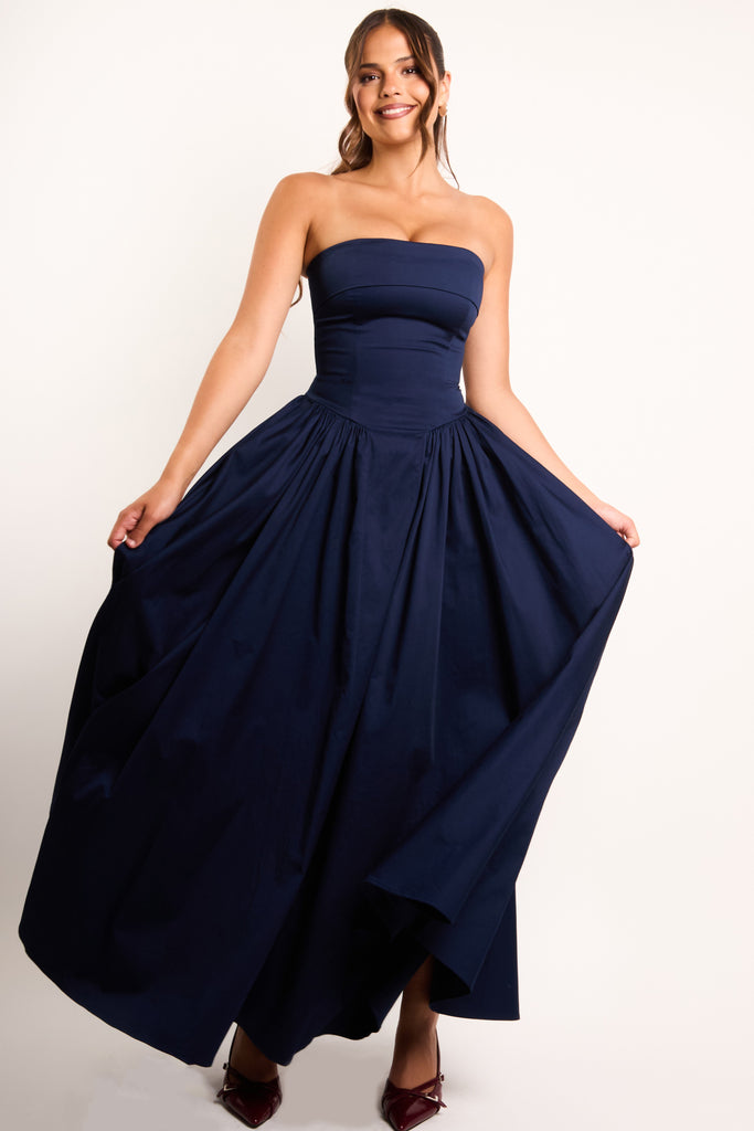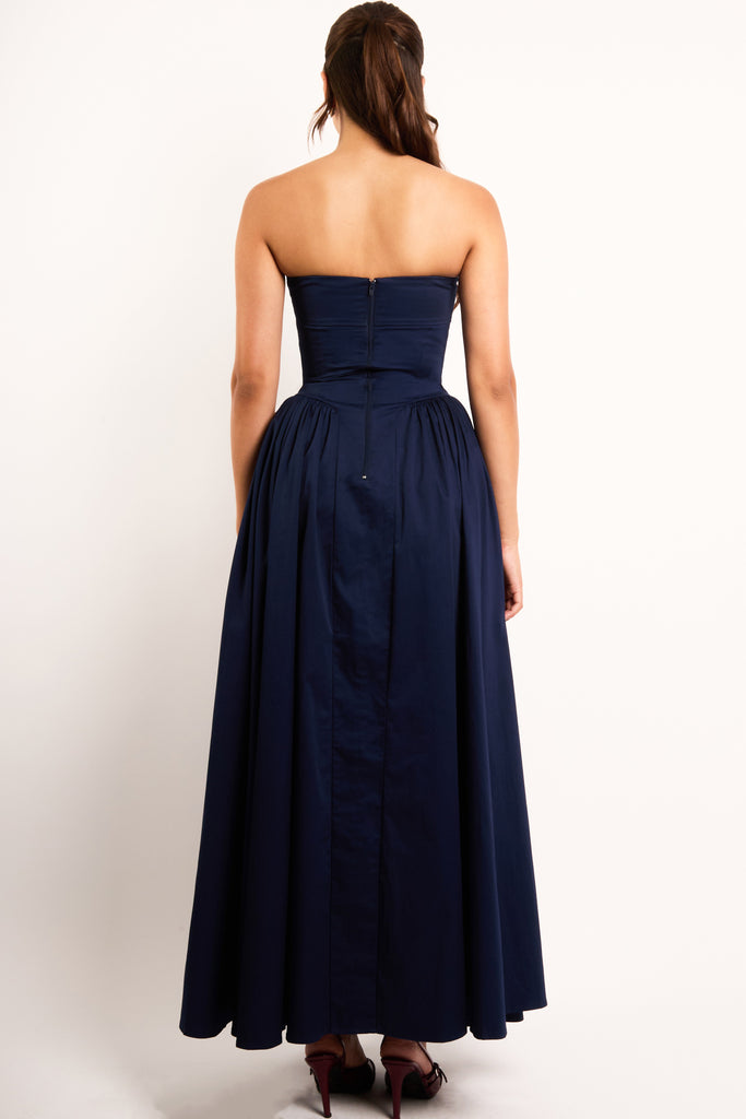 Edith Bandeau Corset Maxi Dress in Navy Blue