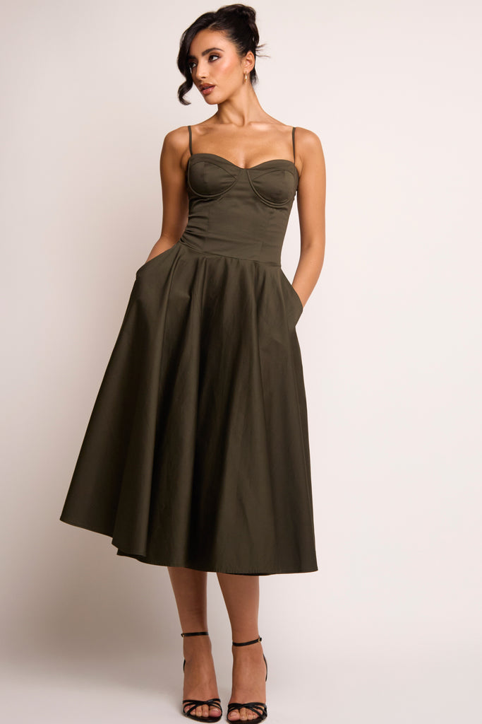 Classic structure in a seasonal shade. The Jade Midi Dress is reimagined in a deep winter olive green, offering understated sophistication with a sculpted finish. The corset-style bodice with internal boning and underwired cups creates a flattering, supportive shape, while adjustable slim straps and soft gathering through the midi skirt add effortless movement. Complete with hidden pockets and a sleek back zip, it’s an elegant staple for the colder months.