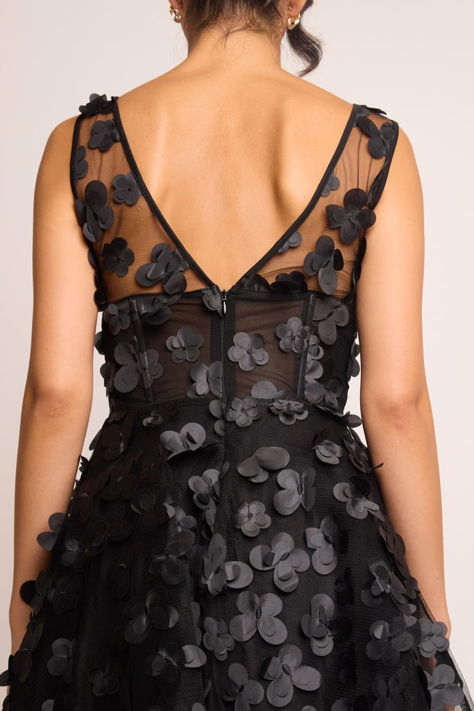 Whimsical detailing meets sculpted elegance. The Jikara Mini Dress is crafted from layers of black mesh, adorned with delicate 3D floral butterfly appliqués for a romantic, textured finish. The plunging neckline and corset-style boning define the bodice, while the triple-layered A-line skirt adds volume and movement. A statement mini that balances playful detail with timeless structure.