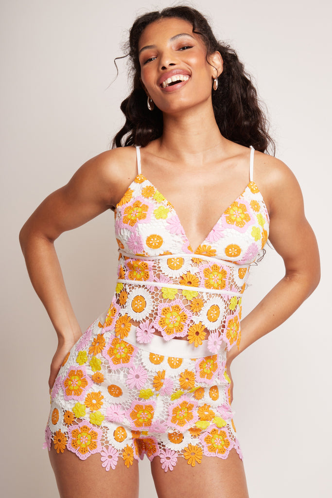 Bring the sunshine with the Joya Tropic Crochet Cami Crop Top — the ultimate festival-ready piece for your summer wardrobe. Bursting with vibrant tropical tones of yellow, orange, pink, and white, this playful crochet top features a flattering cropped cami silhouette with adjustable tie-back straps for a custom fit. With its delicate floral crochet detailing and breezy backless design, it's the perfect statement top for hot days and even hotter nights.