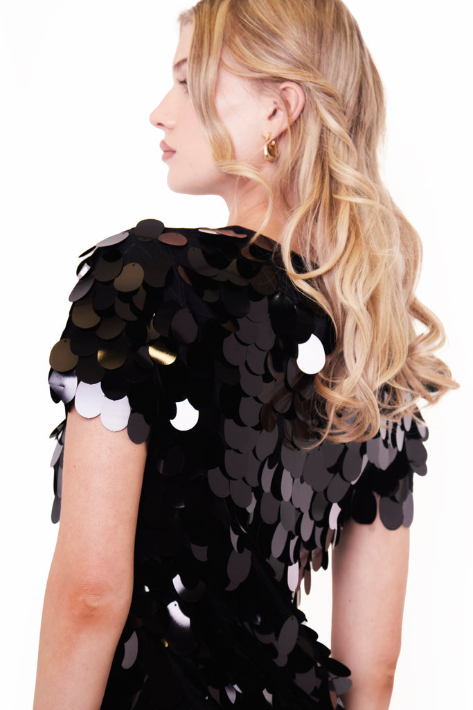 Turn heads in the Kimber Black Disc Sequin Mini Tshirt Dress, a bold and dazzling statement piece. Designed with jumbo disc sequins on a mesh base, this shift t-shirt mini dress creates a high-impact shimmer with every move. The relaxed silhouette offers effortless glamour, while the soft lining ensures all-day comfort. A must-have for those who love to shine with confidence.