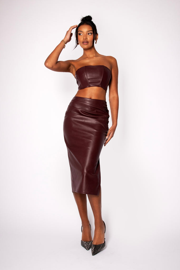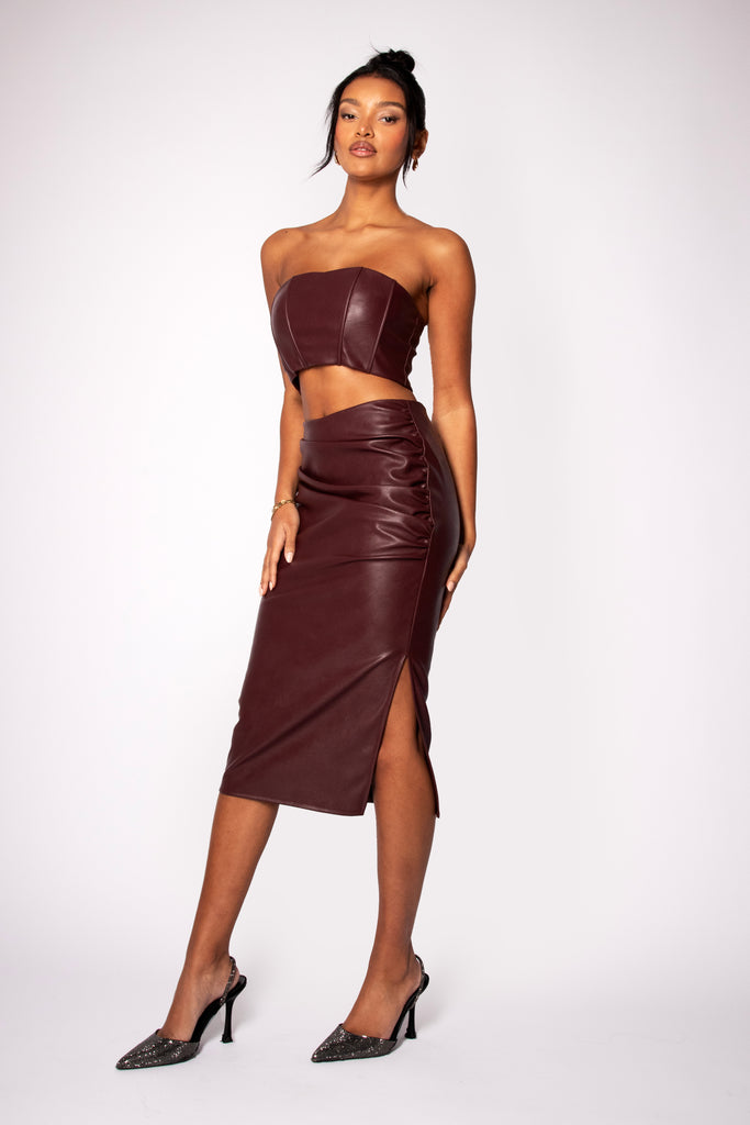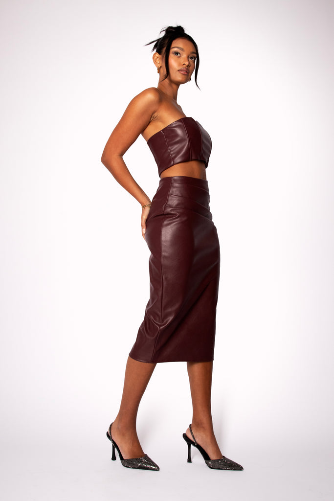 Maria Burgundy Faux Leather Gathered Side Midi Skirt