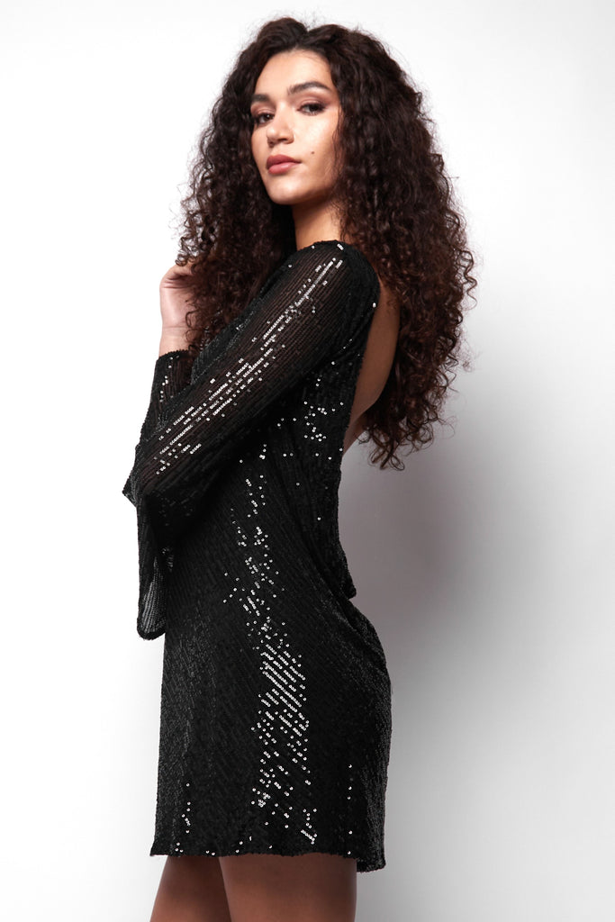 Paris Flared Sleeve Cowl Back Sequin Mini Dress in Black