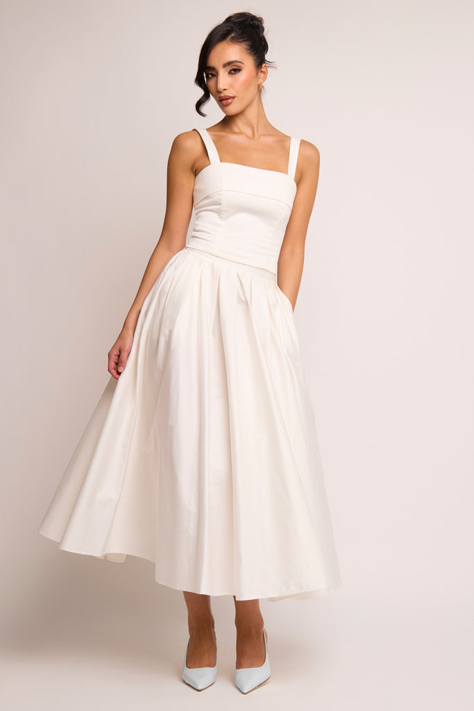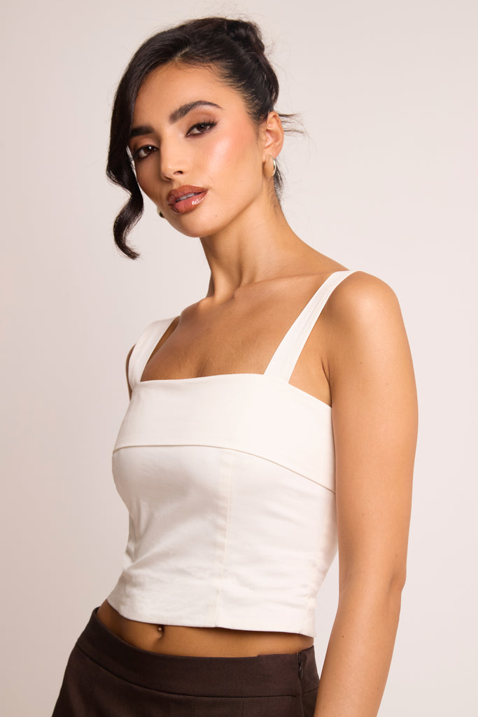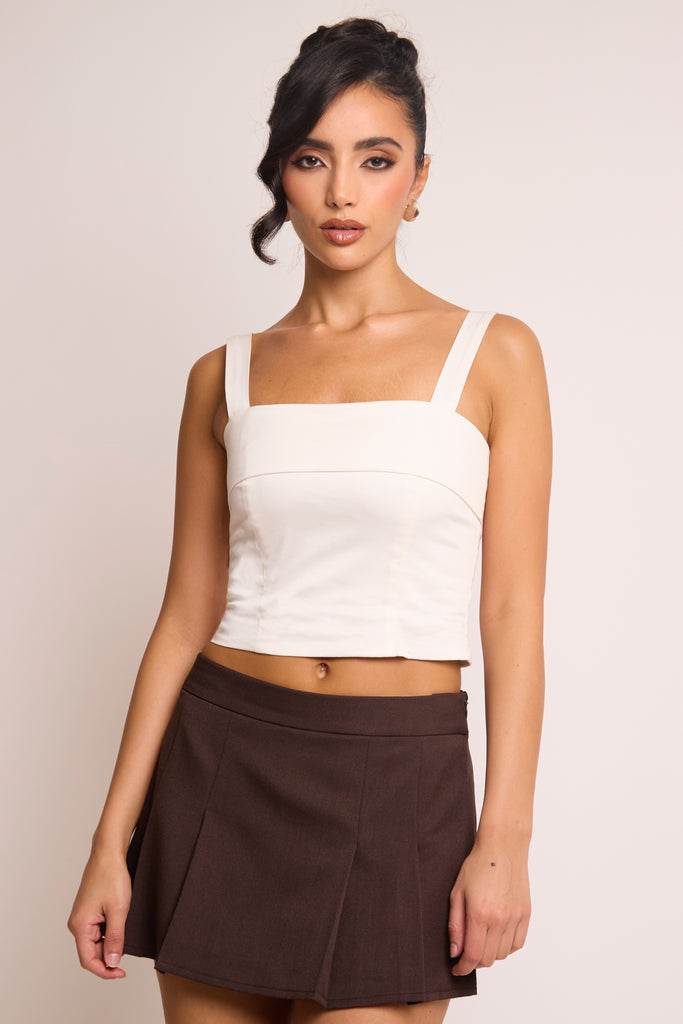 Effortlessly structured and endlessly versatile. The Reeta Top is crafted from breathable white cotton with internal boning and panel detailing for a defined, waist-cinching silhouette. Featuring a folded square bandeau neckline and wide adjustable straps, this sculpted cropped top combines classic tailoring with modern femininity. Finished with a concealed side zip for a smooth, seamless fit. Style it with a statement mini for drinks out, or pair it with the matching Daisy Box Pleat Midi Skirt for a refined co-ord look.