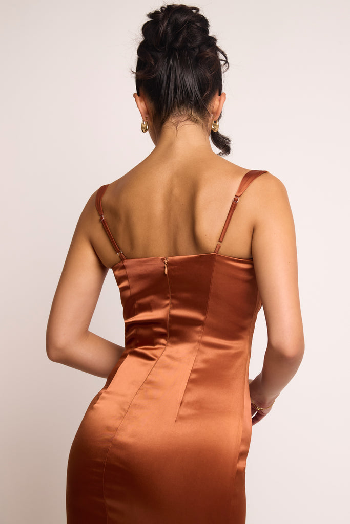 Sleek sophistication in a statement hue. The Selma Maxi Dress is cut from a silky satin in a rich rusty orange shade, designed to glide across the body with a fluid, form-fitting silhouette. The boned bustier with structured cups provides subtle lift and shape, while tapered adjustable straps ensure the perfect fit. Finished with a slight fishtail hem, this dress blends sultry elegance with timeless appeal.
