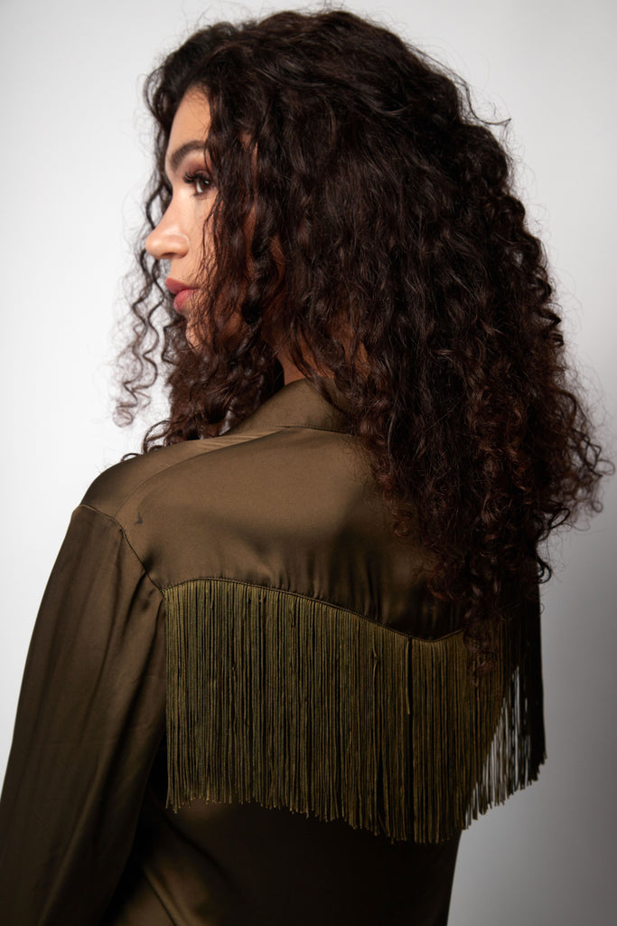 Add a touch of western-inspired chic to your wardrobe with the Simma Khaki Fringe Shirt Dress. This versatile dress features a stylish button-down front and is designed in a rich khaki hue that flatters any skin tone. The standout detail is the bold fringe across the chest, adding movement and texture to your look. The long sleeves with cuffed detailing and classic collar give it a refined finish, making it perfect for both casual outings and trendy evenings.